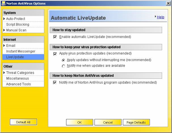 By configuring LiveUpdate as shown below, the LiveUpdate that NIS starts automatically will update your system more quickly and without user-interaction most of the time.